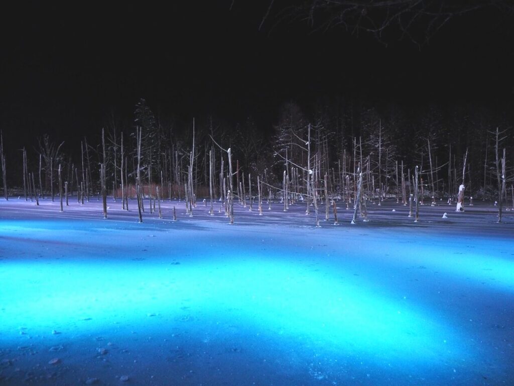美瑛の「青い池」や「白ひげの滝」のライトアップも写真映えスポットとしておすすめです。