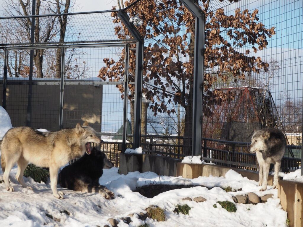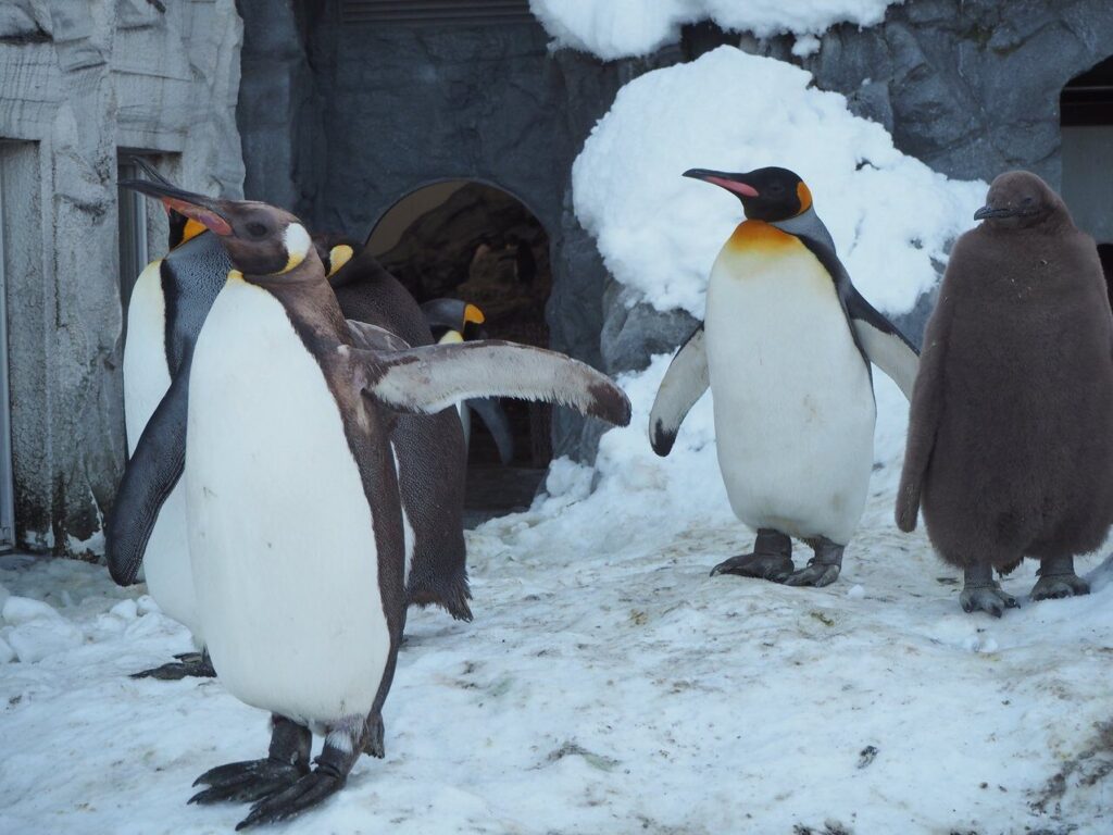 雪道をよちよち歩くペンギンの散歩やオオカミのくつろぐ姿を観察できます。