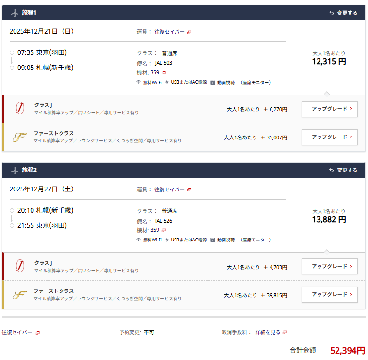 | JR・バス代 | 新千歳→函館:約1万円+函館→札幌:約1万円+札幌⇔小樽:約1,500円+他3,500円 | 約25,000円~ |