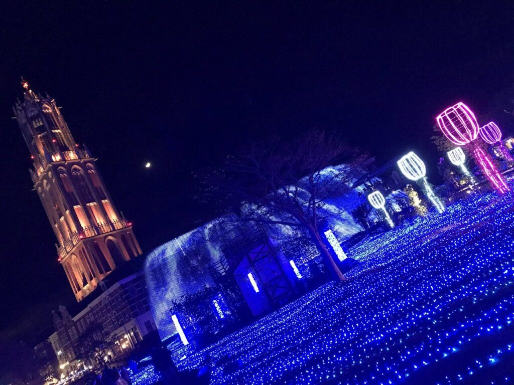 午後は長崎県のハウステンボス方面へ。パークにしっかり入場して丸一日楽しむパターンもあれば、周辺ホテルにチェックインして、イルミネーションと夜景だけを楽しむライトな過ごし方もあります。