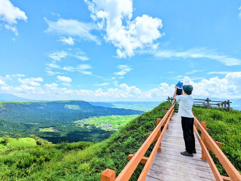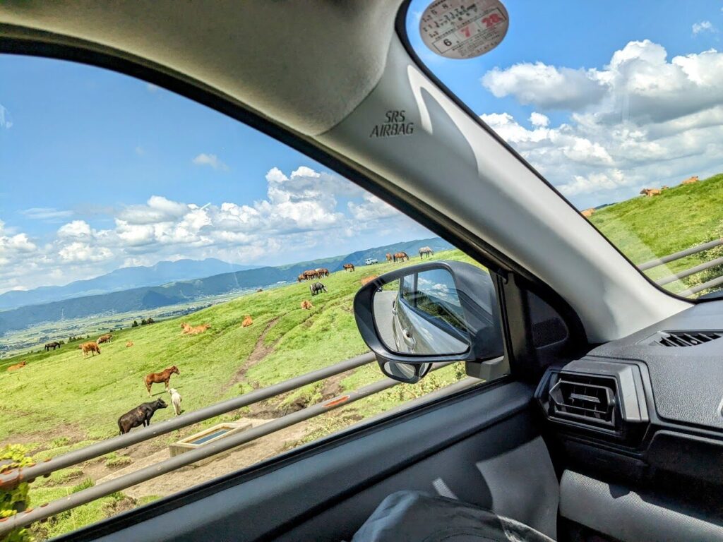 城下町の雰囲気を感じた後は阿蘇エリアへ向けて出発します。市街地を抜けると、徐々に視界が開け、カルデラ地形ならではの広大な風景が広がります。