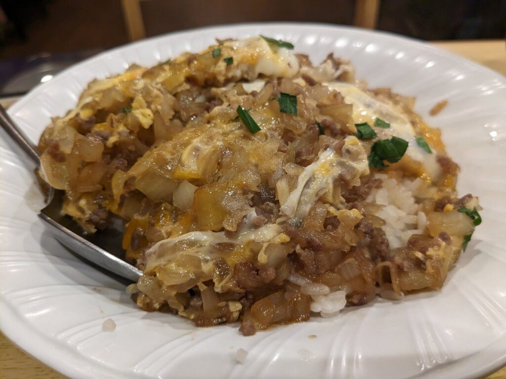 私のおすすめは、ちゃんぽんです。沖縄のちゃんぽんは、麺ではなく野菜炒めを卵でとじてご飯の上にのせた丼もので、甘く味付けした卵と出汁がご飯に絡まり美味しいです。