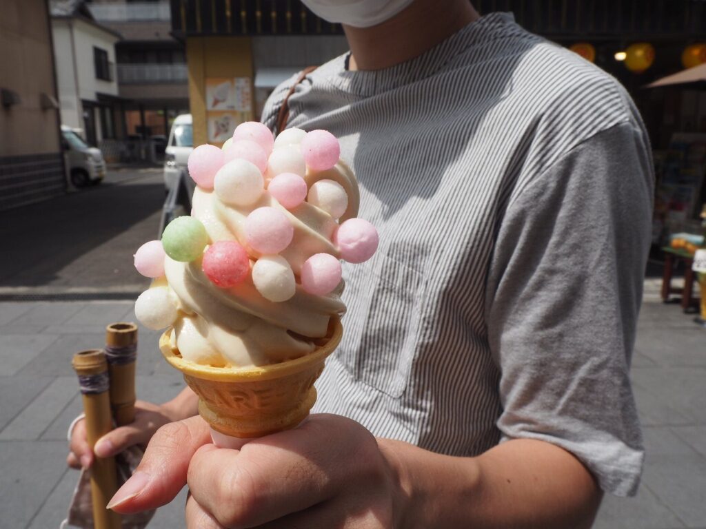 疲れた後は、香川県の伝統的な縁起菓子「おいり」をトッピングした、見た目も可愛らしく幸せを呼ぶご当地ソフトクリーム「おいりソフト」などがおすすめです。