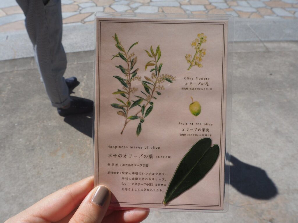 ちなみに、近くのオリーブ畑でハート♡の形の葉っぱを見つけると栞にしてもらえます。時間に余裕があれば探してみてください。