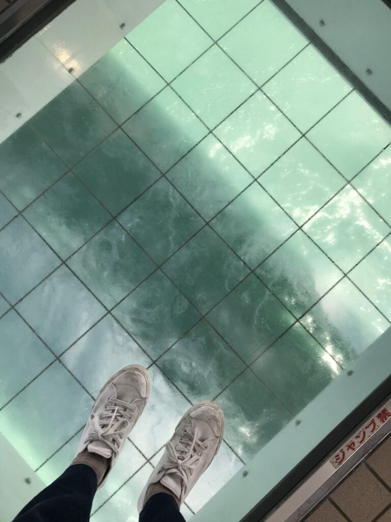 海上遊歩道「渦の道」では、足元のガラス窓から渦巻く潮流を真下に見ることができ、その轟音と迫力に圧倒されます。